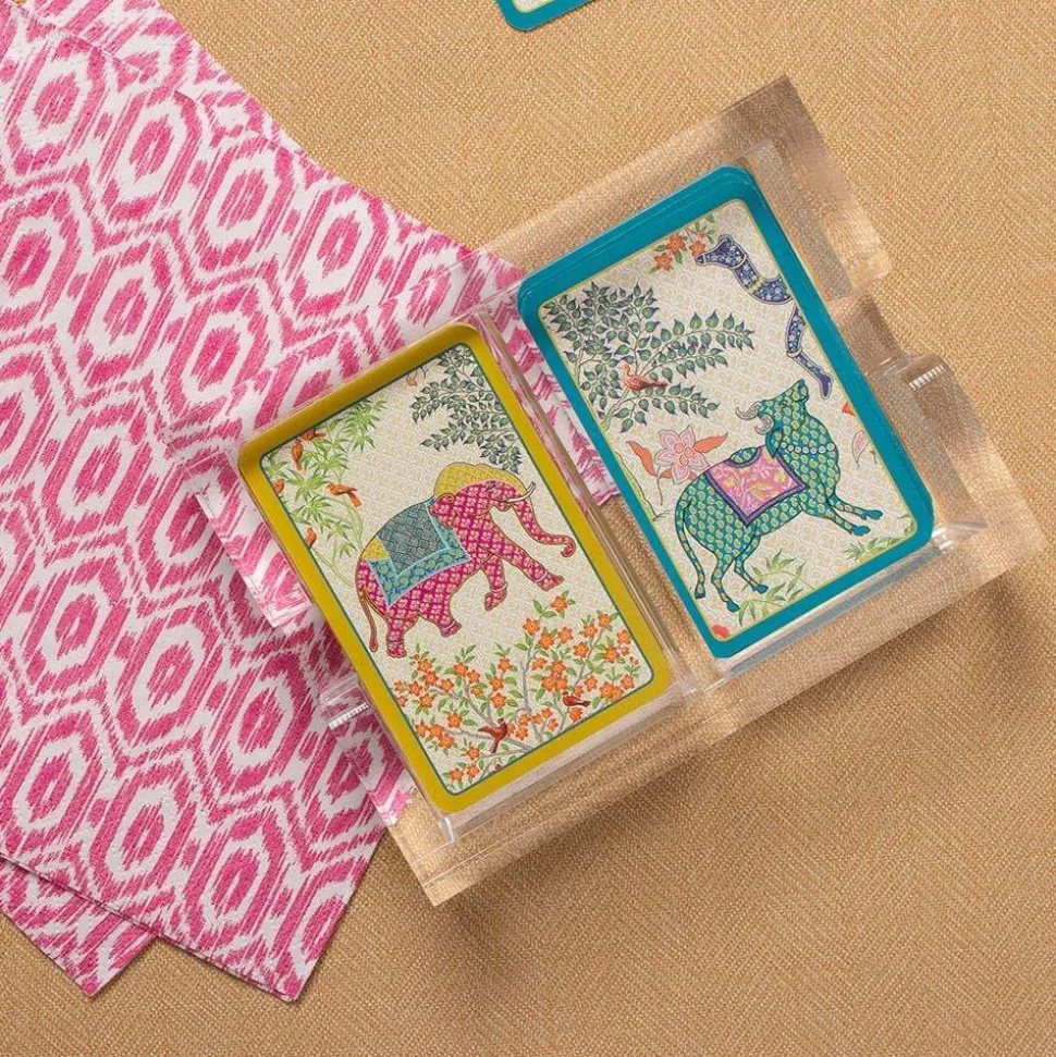 An elegant tabletop accent for avid card and bridge players, our acrylic card holder keeps artfully designed Caspari playing cards organized and on display. It’s made from a durable acrylic material that gives it a sleek, modern look. Designed to hold two decks of 2.25” cards, it makes a lovely gift when paired with our bridge and playing card sets. Perfect for giving or keeping for yourself to display in your living room, guest room, and more. Not suitable for all standard card decks.