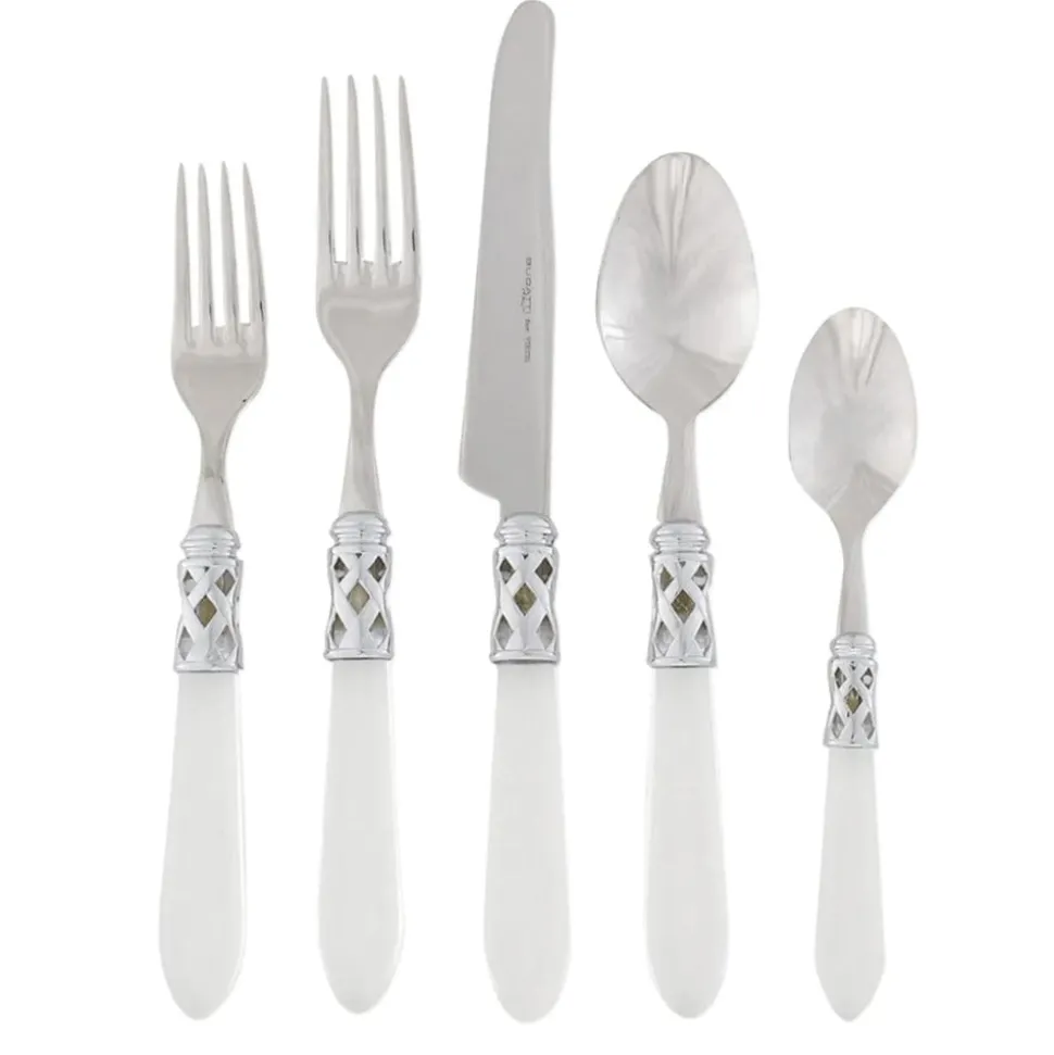 The Aladdin Brilliant Five-Piece Place Setting features elegant pearlized handles with the strength of high-grade acrylic and 18/10 stainless steel.