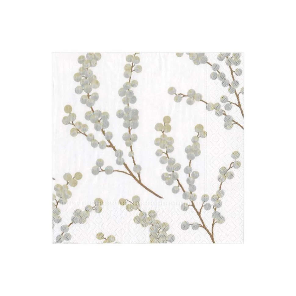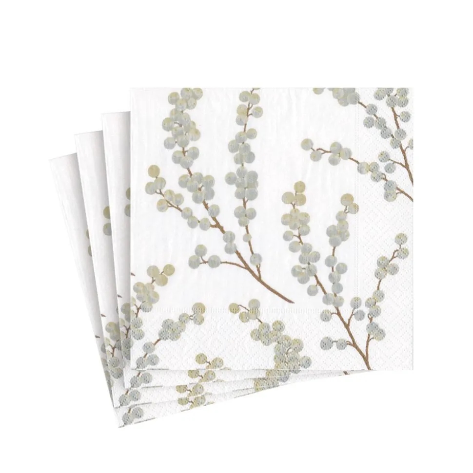 Berry Branches Paper Cocktail Napkins in White & Silver - 20 Per Package