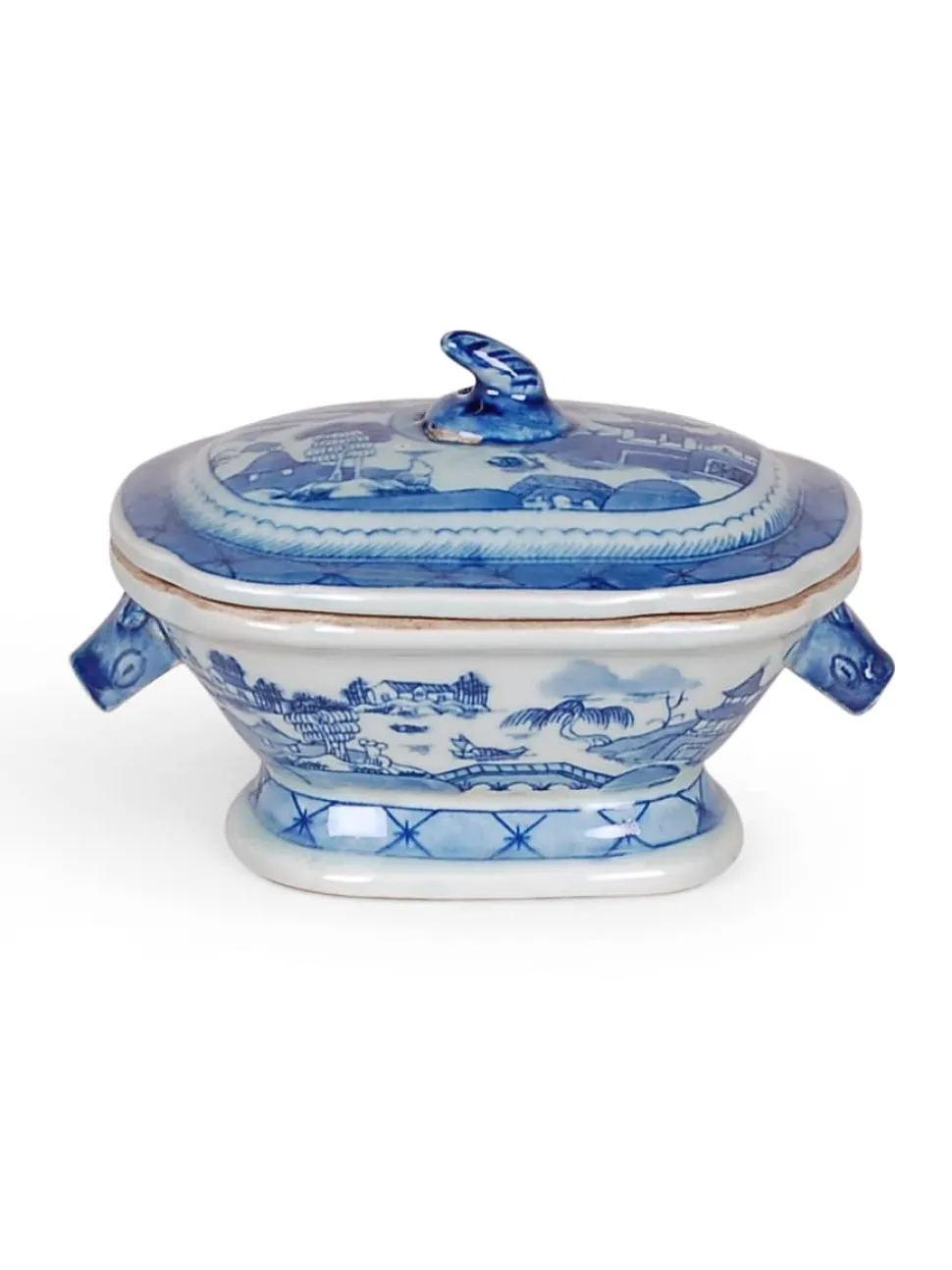 A lovely, mini porcelain tureen with lid in a classic blue and white Canton design. This reproduction tureen is hand-made and hand-decorated, therefore some variations may occur and items may contain imperfections that provide more character. At only 7″ high, this is just the right size for a book shelf, mantle or any place that needs a small, perfect touch of blue and white.