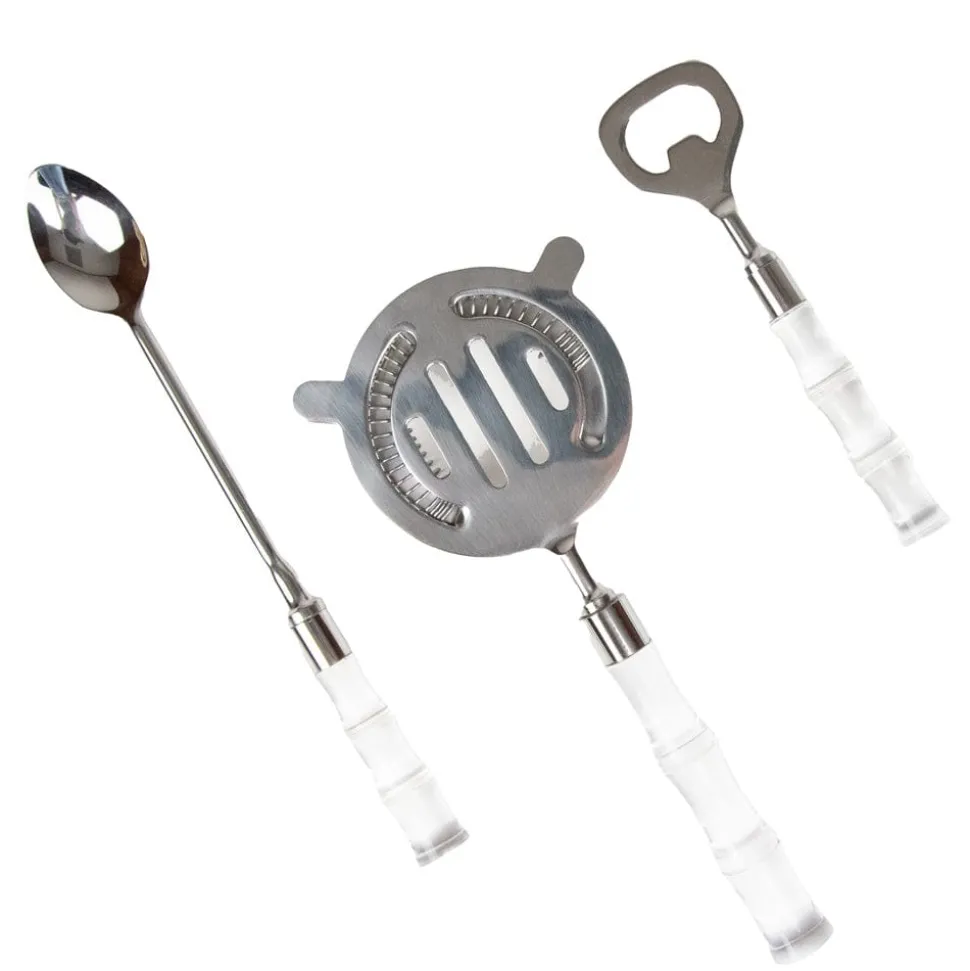 Here’s a new twist on the classic look of bamboo for the bar with our stylized Bamboo Barware Set. Featuring a Shiny Silver finish and clear handle, this Barware set makes a perfectly stylish gift or keep it all to yourself. Each 3 piece set includes a Bar Spoon, Hawthorne Strainer and Bottle Opener.