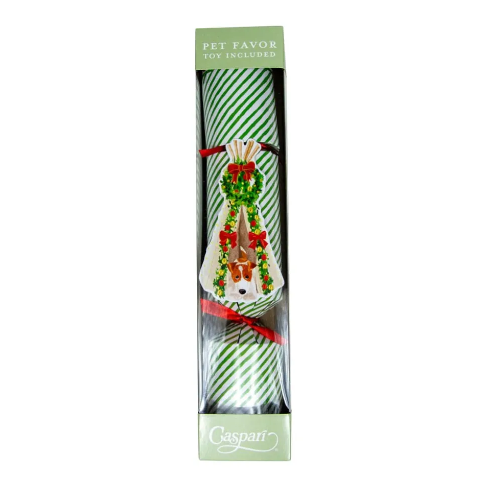 Now, however, you can bring your pet in on the fun. This individual 12-inch long cracker contains a single pet toy trinket. Each of the cracker’s three segments is wrapped in classic Caspari paper and separated by a bow. Grab the end segments and pull apart to open the center section with a “bang” and reveal the prize inside.