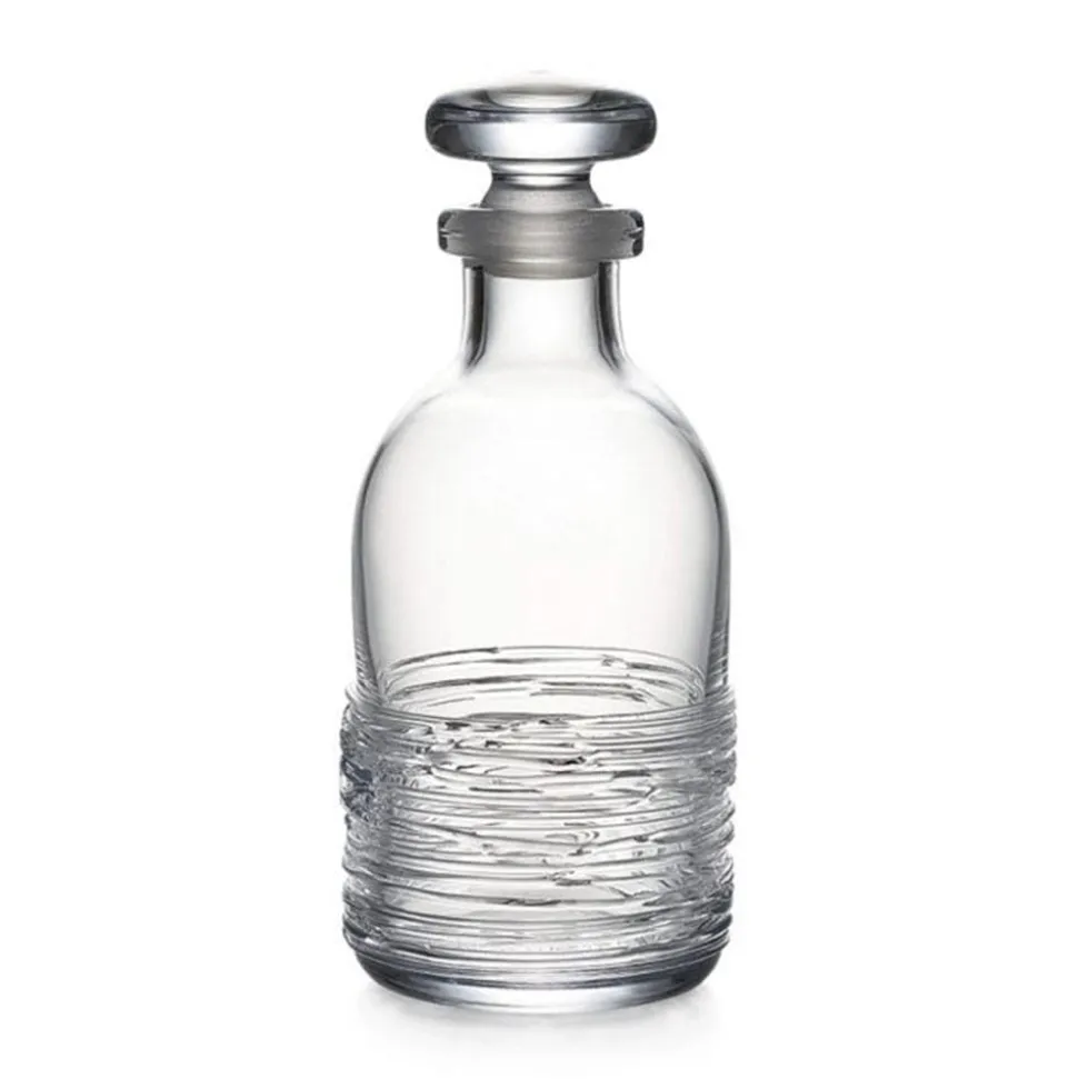 In a bold interpretation of the craft, master glassblowers nimbly wrap fine strands of glass around the bottom third of a cylindrical silhouette to form the unique, natural texture of this decanter.