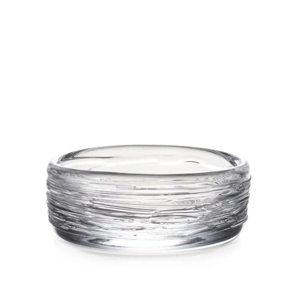 In a bold interpretation of the craft, master glassblowers nimbly wrap fine strands of glass around the bottom third of a cylindrical silhouette to form the unique, natural texture of this wine coaster.