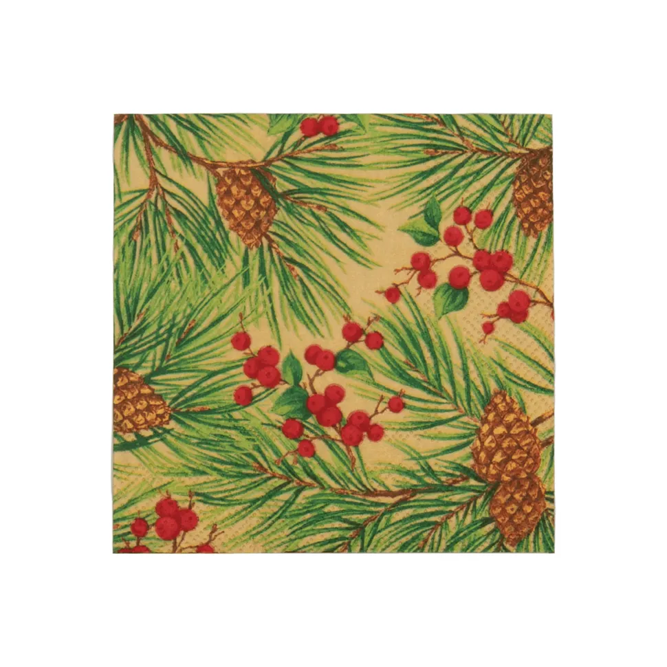 Evergreen and Berries Gold Cocktail Napkins - includes 20 Cocktail Napkins