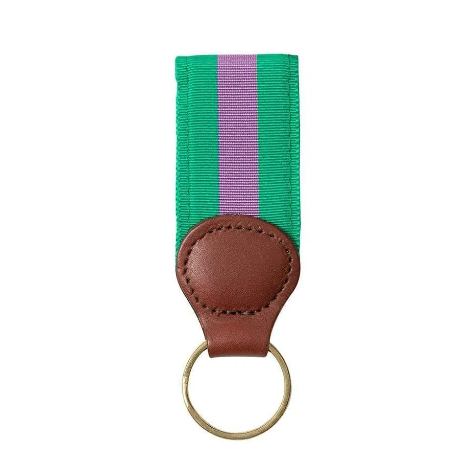 Handcrafted in the USA, this fashionable key ring features genuine top grain leather and textured grosgrain ribbon.