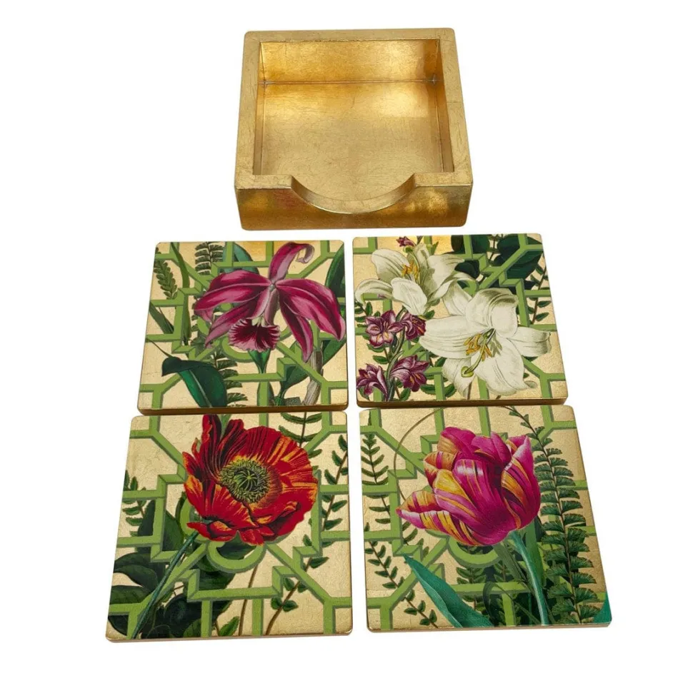 - 4″Sq. Coasters, 4.75″Sq. Holder