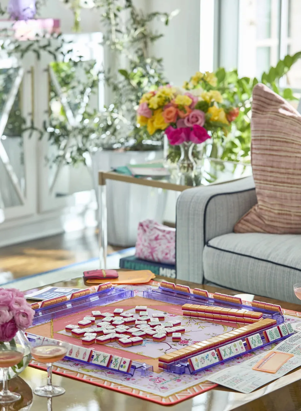 Meet the Goldie Mahjong Mat, created with Catherine Cartie to complement the Sunset Tiles. This mat captures the warm, golden hues of a perfect sunset, paired with radiant pink and coral tones to evoke the beauty of evening light. Goldieās neoprene construction makes it easy to clean, and its rubber non-slip backing keeps it firmly in place. Instructional reminders along the edges make gameplay elegant and effortless, while its bold design adds a touch of warmth to any game night.Ā