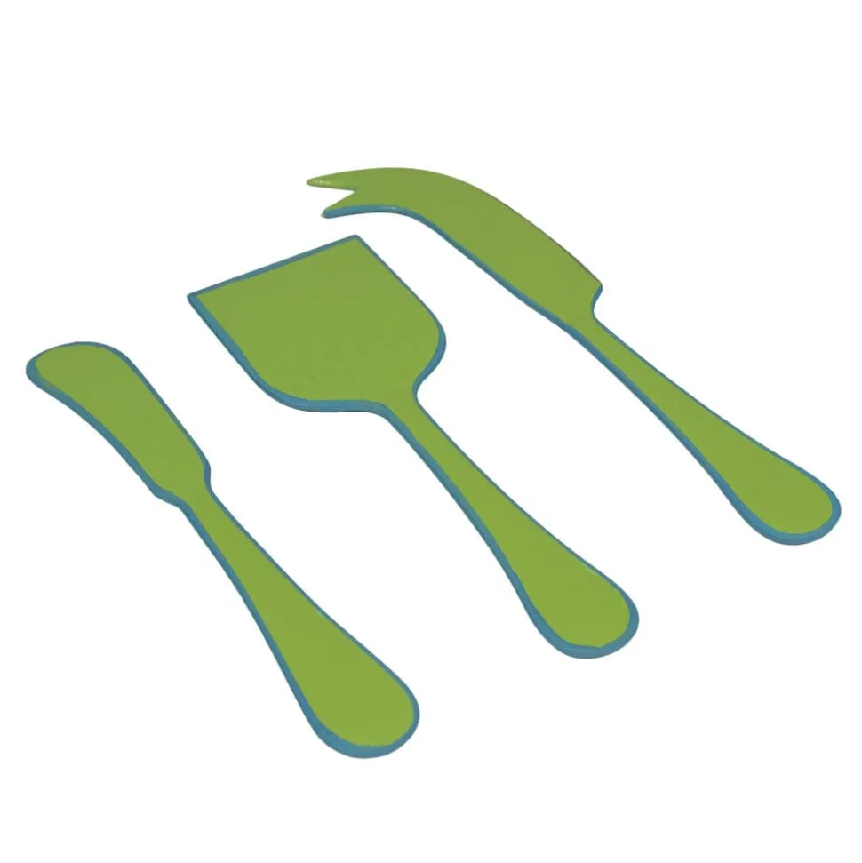 A fun way to add a pop of festive color to any cheese board, this set of Enameled Cheese Knives features solid color with a contrasting piping all around the edge of each piece. Set includes a pronged cheese knife, spreader and chisel knife.