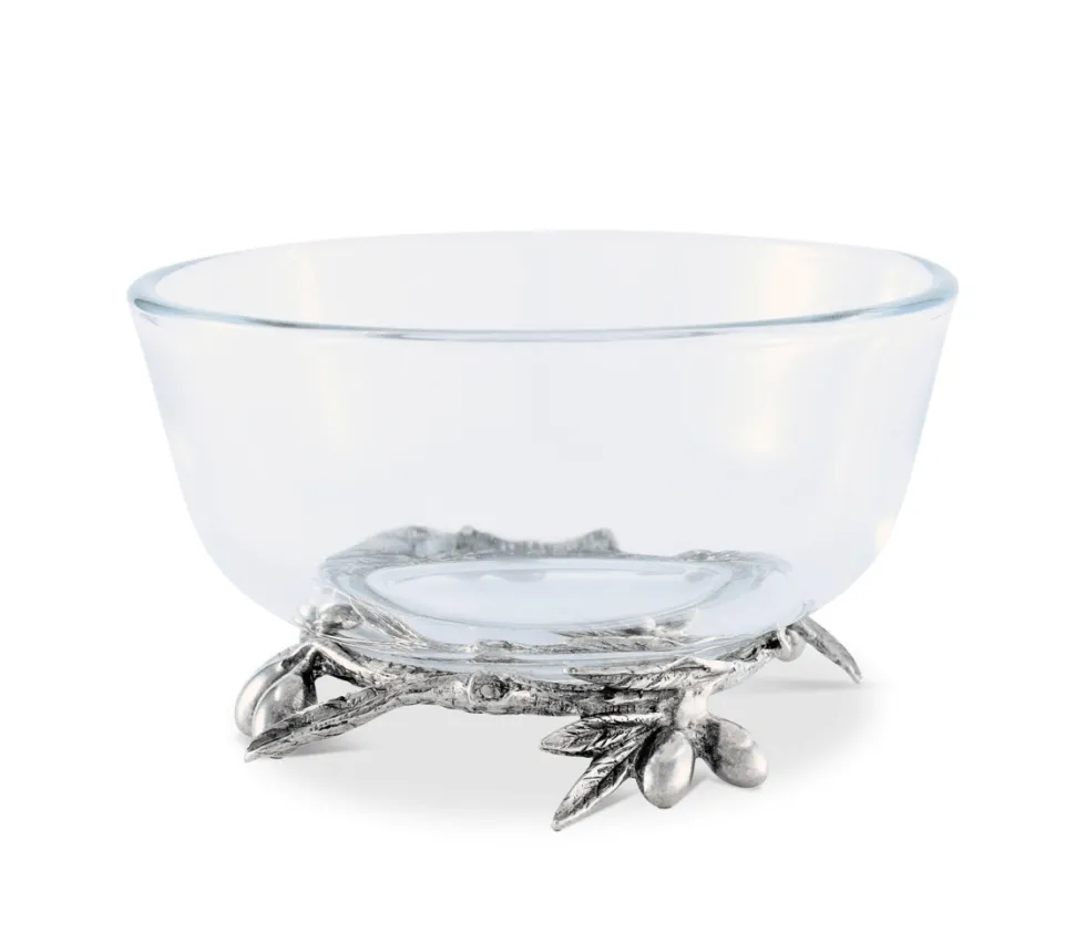 Vagabond House’s Olive Grove Pewter Footed Dip Bowl features a clear, glass bowl with slightly rounded sides resting upon an exquisitely detailed, pewter olive wreath. Double clusters of olives form the feet of the bowl.
