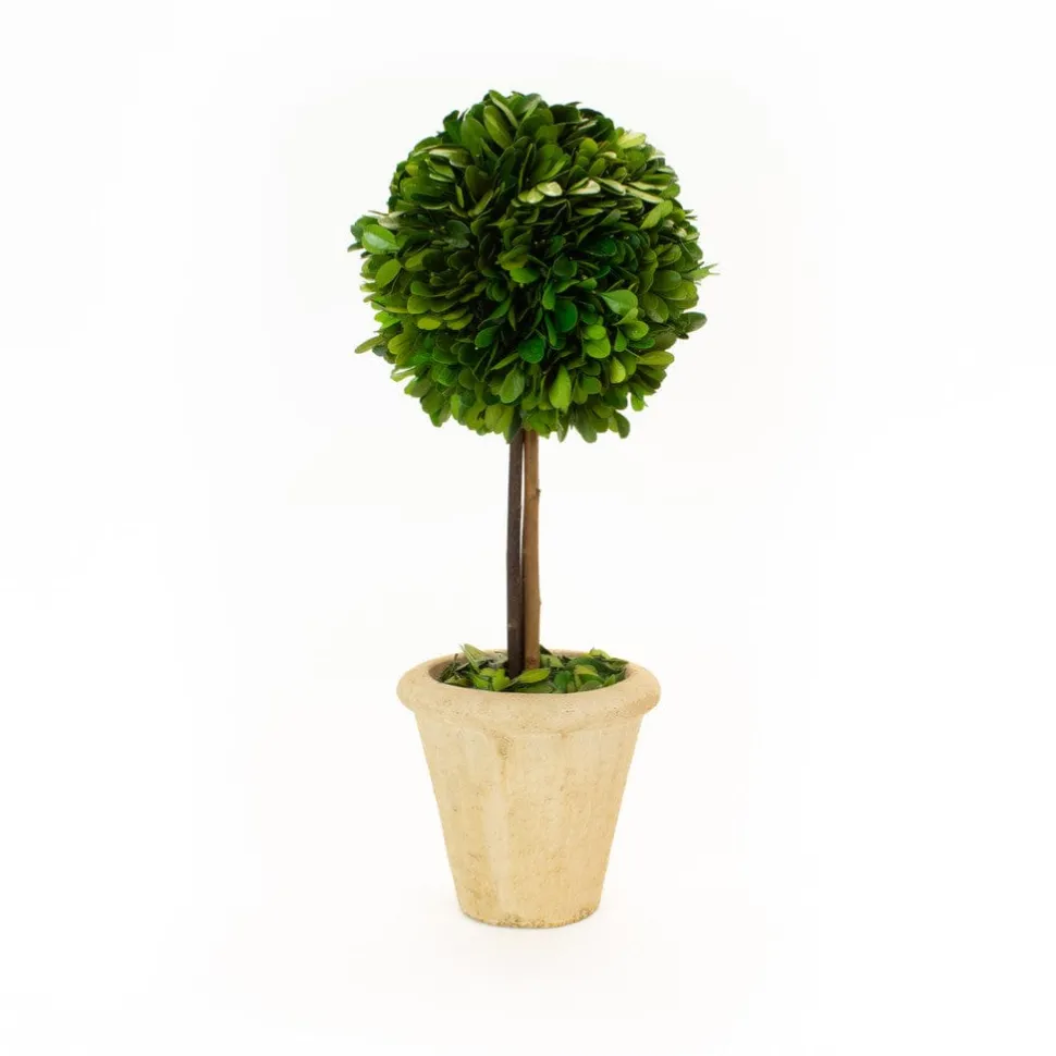 This preserved boxwood topiary ball is the perfect addition to any desk, dresser, or table for some added charm to your home. Nestled in a cream colored ceramic pot, this vivid green preserved boxwood ball is assembled on top of a sturdy brown stem. Lightly mist once a month and keep out of direct sunlight in order to keep the life of the topiary fresh.
