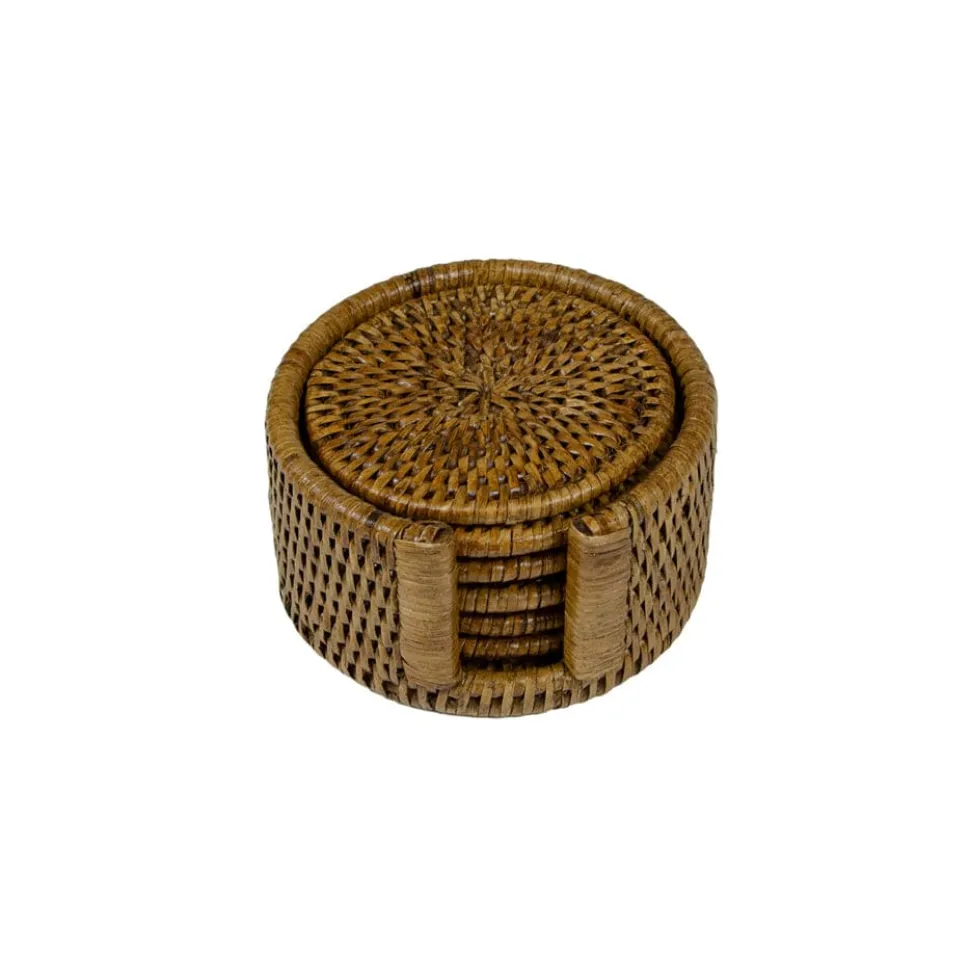 Perfectly sized to hold Caspari paper and paper linen napkins, our napkin holders are an easy addition to your tabletop decor. These are in a set along wiht out lovely rattan coasters. Use them to keep napkins neatly presented and always within reach in your dining room, on your coffee table, kitchen counter, or in a guest bath. Our rattan style napkin holders coordinate well with all Caspari Napkin designs, colors, and seasonal styles. The collection is crafted from naturally beautiful woven rattan material. Each can hold up to 2 packs. Can be used for indoor or outdoor entertaining but are not suitable for outdoor storage or exposure to inclement weather conditions.