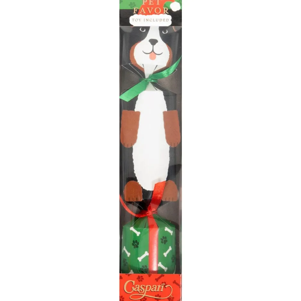 Now, however, you can bring your pet in on the fun. This individual 12-inch long cracker contains a single pet toy trinket. Each of the cracker’s three segments is wrapped in classic Caspari paper and separated by a bow. Grab the end segments and pull apart to open the center section with a “bang” and reveal the prize inside.