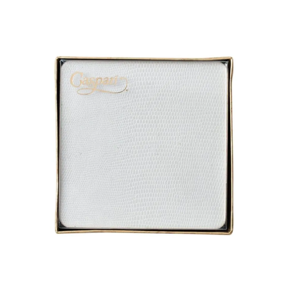 Caspari’s felt-backed Lizard Coasters are handcrafted in our own bindery in the United States and are a part of the Gallery Collection, which incorporates the same artisan skills used in centuries past to create beautiful and high-quality handmade goods. The top surfaces of our coasters are made from a durable, embossed faux leather with a felt backing. The sets are a lovely addition to any tabletop and keep your surfaces well protected. Eight coasters arrive in a gold box, which is perfect for gifting.