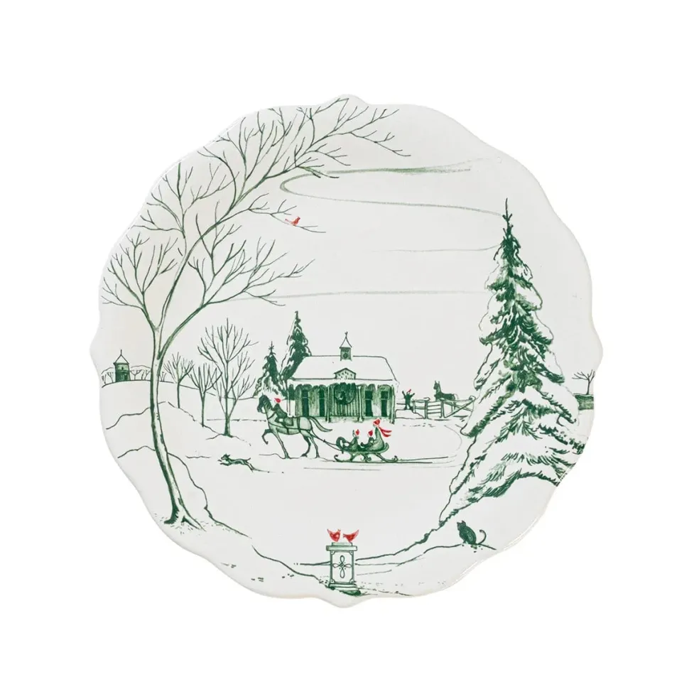 Each picturesque party plate depicts a different charming scene of a Country Estate in winter: building snowmen, ice skating, dog sledding and horse-drawn sleigh rides. With a beautifully scalloped rim, deep evergreen hues and little touches of red, each plate in this set of 4 is a little work of art. Festively presented in a lovely Juliska gift box.